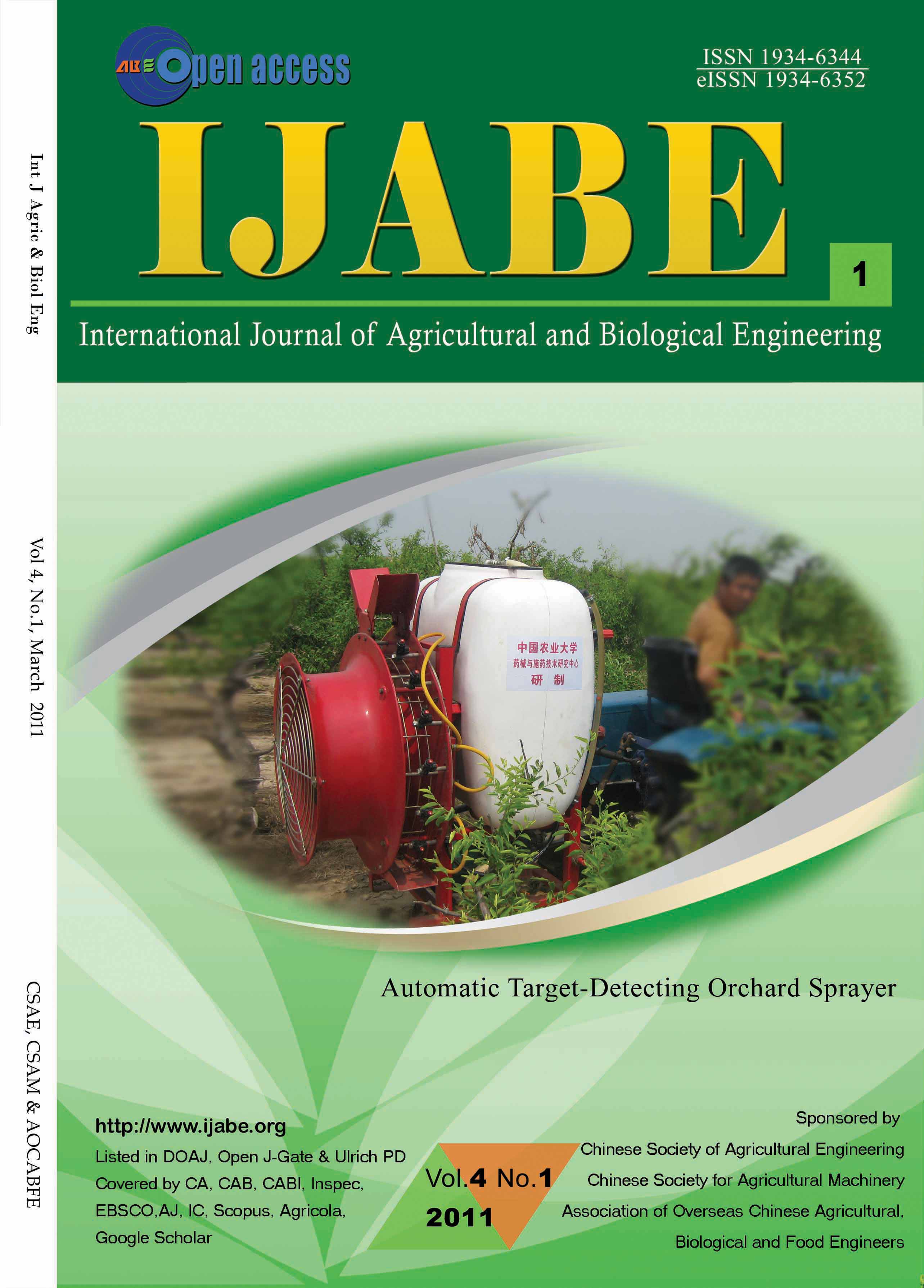 Xiongkui, H. (2011). Automatic Target-Detecting Orchard Sprayer. International Journal of Agricultural and Biological Engineering, 4(1), Cover & Inside Front Cover. https://doi.org/10.25165/ijabe.v4i1.398